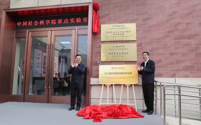 中国社会科学院院长、党组书记高翔,副院长、党组副书记彭金辉为科技考古与文化遗产保护重点实验室、语言学重点实验室、中国社会科学院大学冷门绝学协同创新研究院揭牌 本网记者 朱高磊/摄