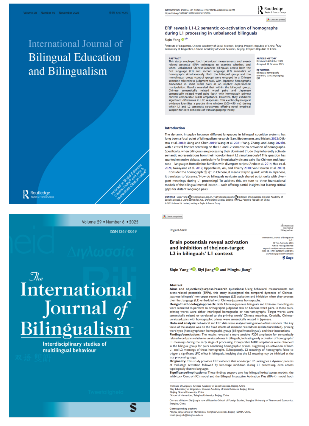 1. Yang, S., Jiang, S., & Jiang, M. (2025). Brain potentials reveal activation and inhibition of the non-target L2 in bilinguals' L1 context. International Journal of Bilingualism.