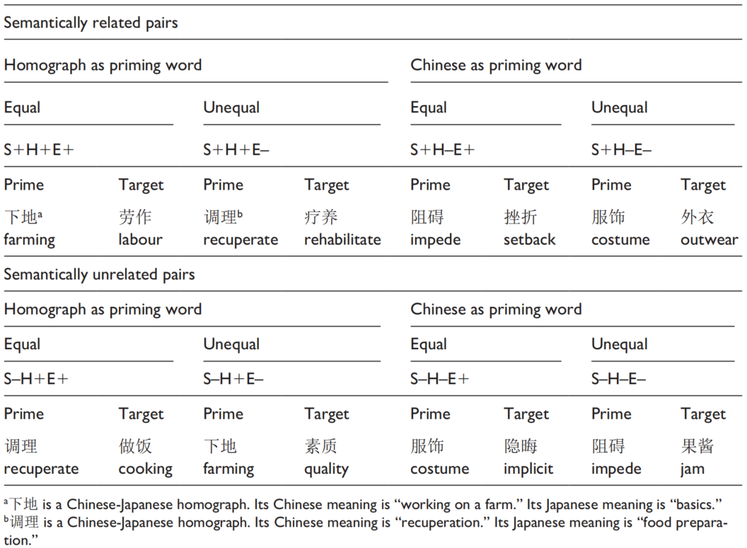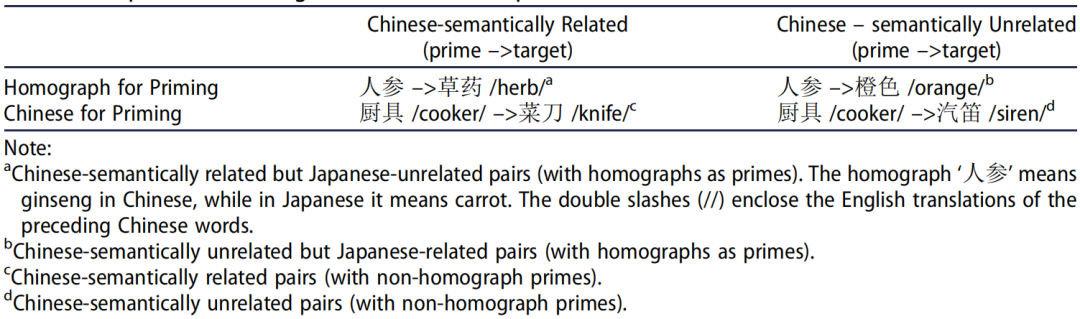 研究一采用高时间分辨率的事件相关电位(ERP)技术,记录了中-日双语者(以汉语为母语的双语者)和汉语母语者(不懂日语)对照组在阅读任务过程中的脑电信号。参与者需直接判断成对的汉语词在语义上是否相关。实验材料如下表所示,