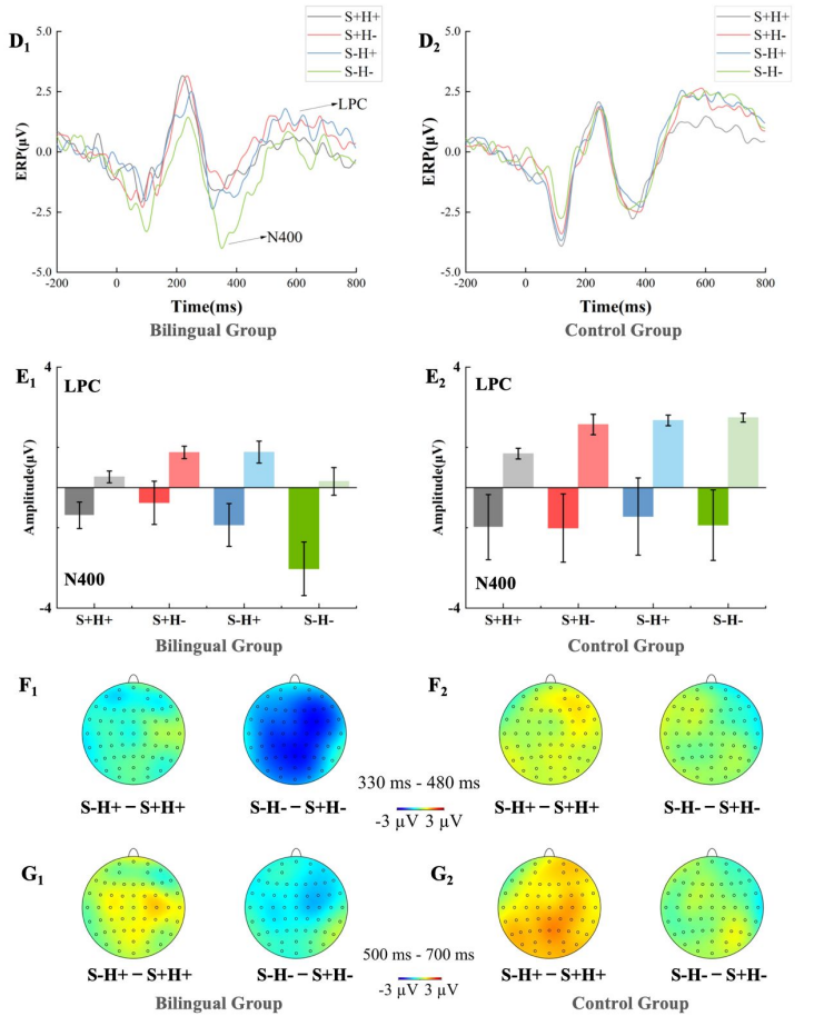 通过对比双语者在这两种条件下N400成分的波幅(N400波幅与语义启动情况相关),可以判断日语语义是否被同步激活。