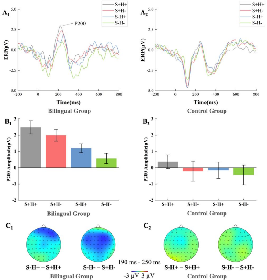 早期阶段(P200, 190-250ms):汉语语义优先激活。在任务早期,大脑首先快速启动了词语的汉语语义。